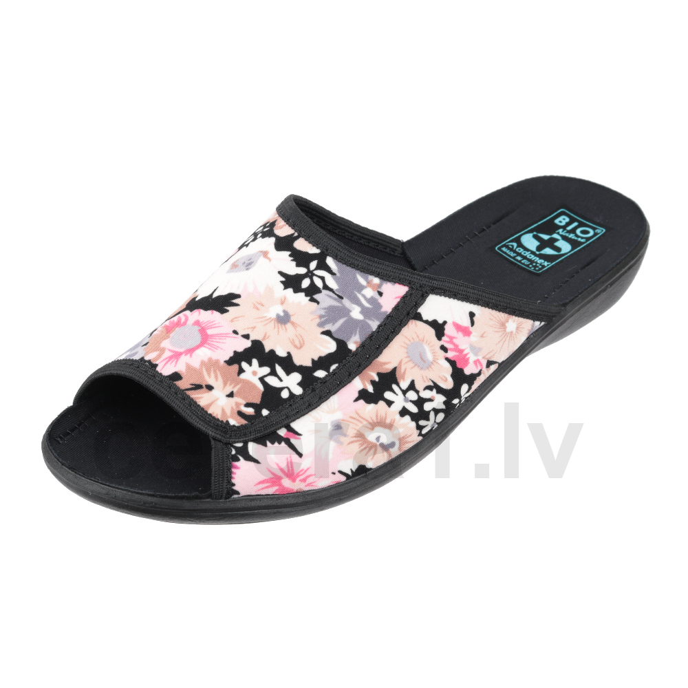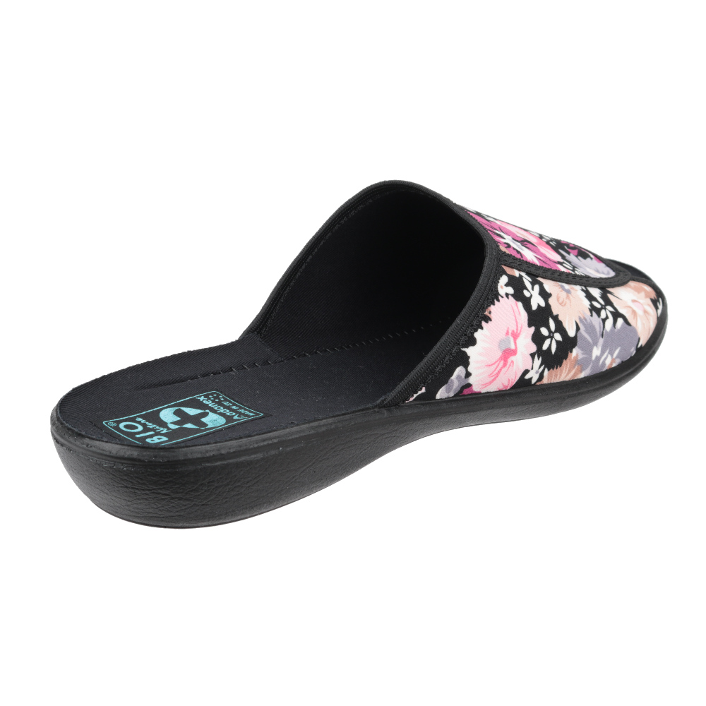 Sieviešu istabas čības. Ārpuses sastāvs – tekstils. Iekšpuses sastāvs – tekstils. Zole – poliuretāns. Papēža augstums – 2.8 cm. Krāsa – puķaina.