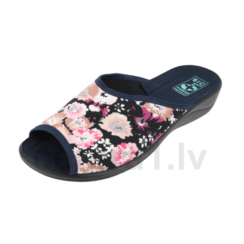 Sieviešu istabas čības. Ārpuses sastāvs – tekstils. Iekšpuses sastāvs – tekstils. Zole – poliuretāns. Papēža augstums – 3.9 cm. Krāsa – puķainas.