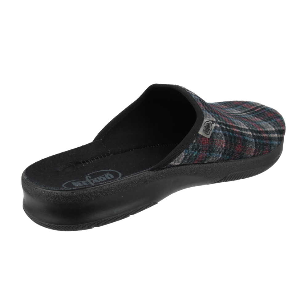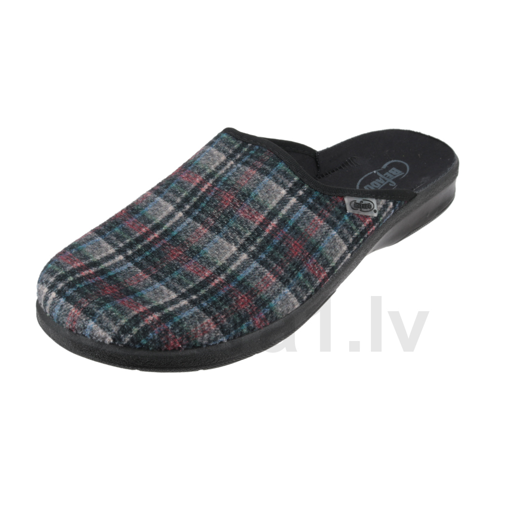 Vīriešu istabas čības. Ārpuses sastāvs – tekstils. Iekšpuses sastāvs – tekstils. Zole – poliuretāns. Papēža augstums – 3.4 cm. Krāsa – krāsaina.