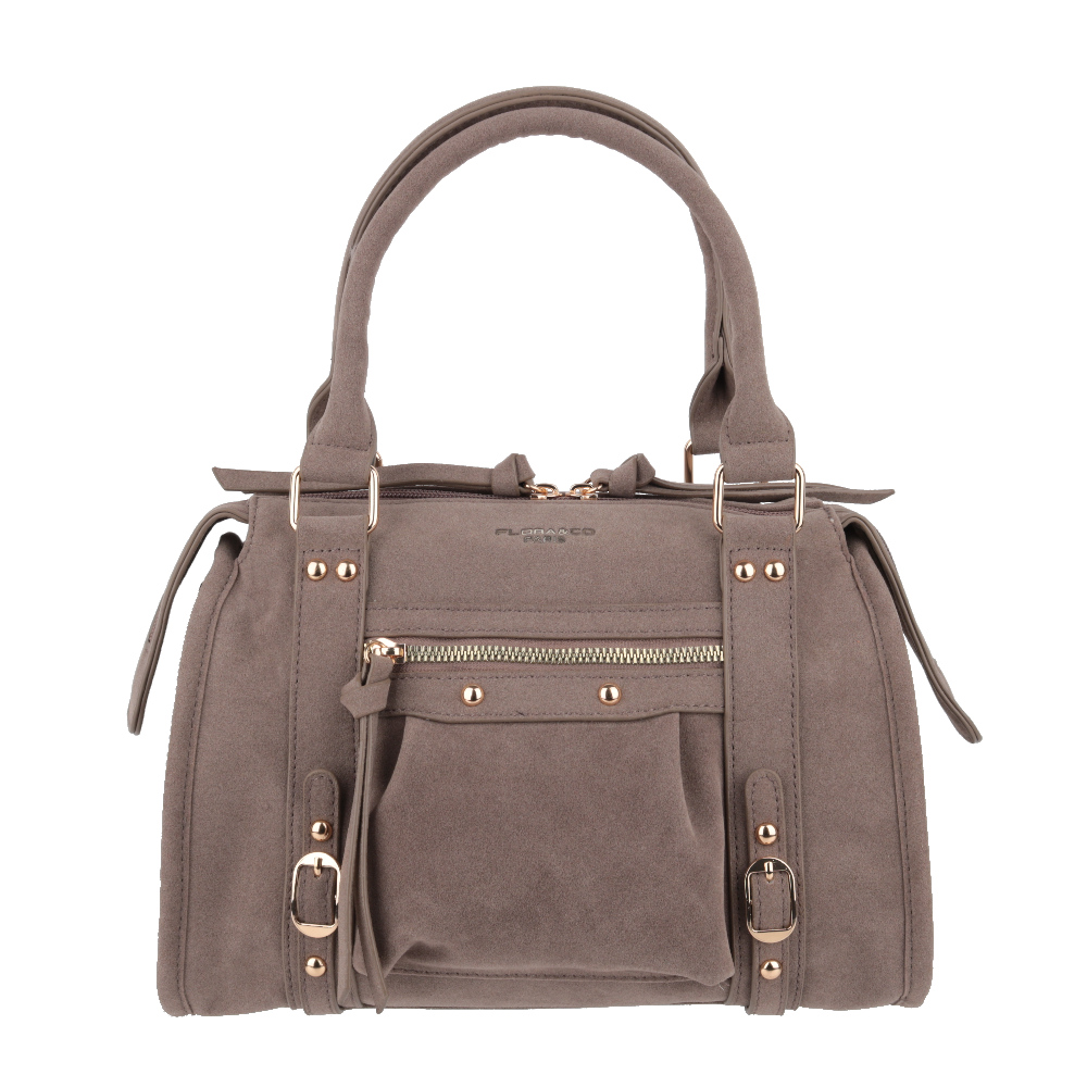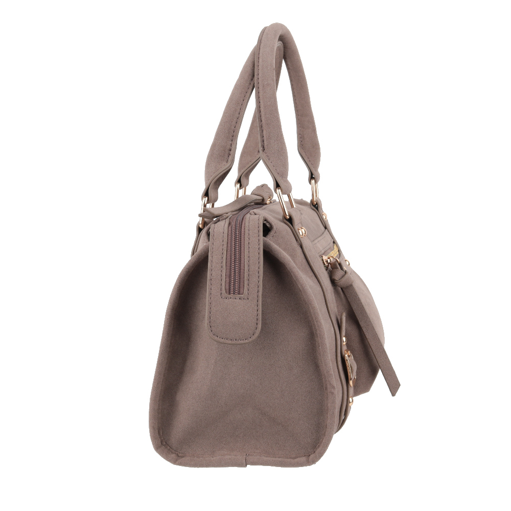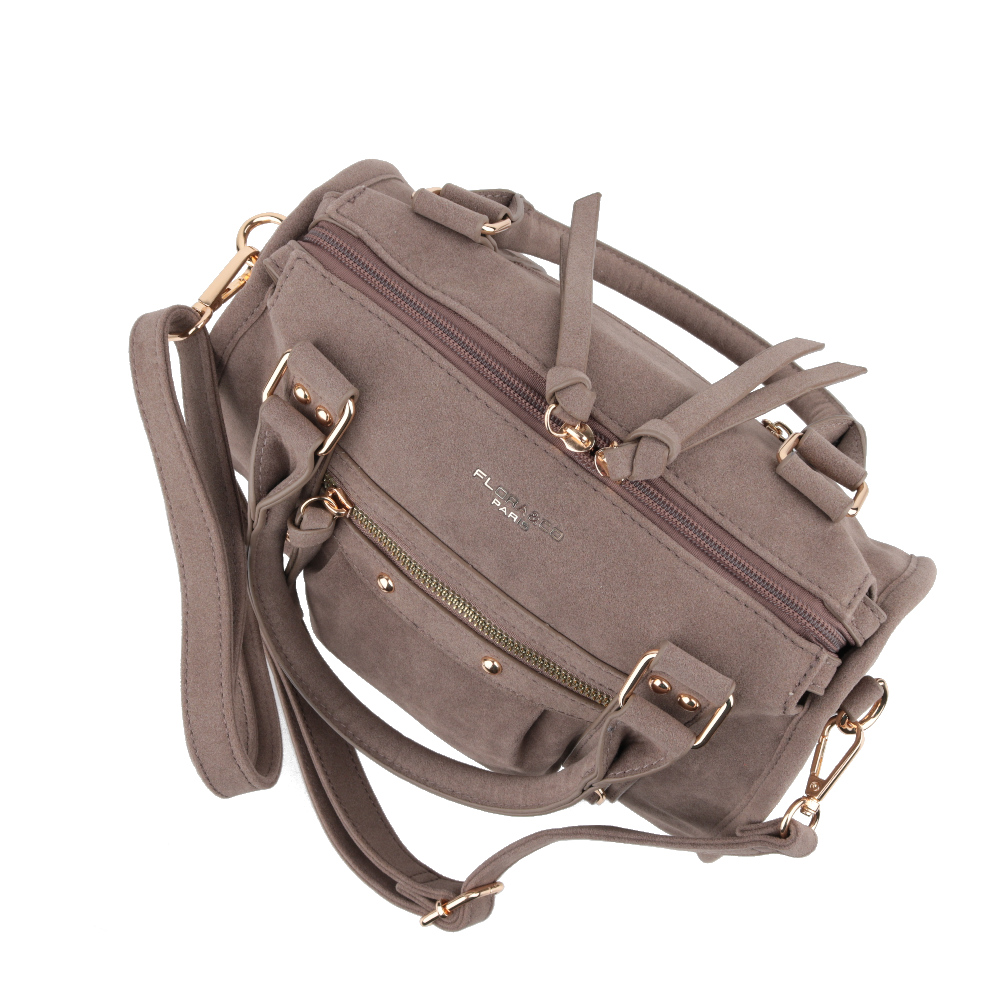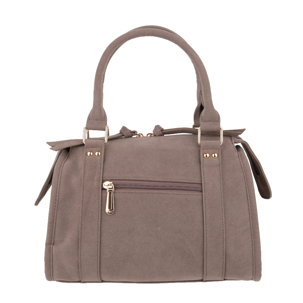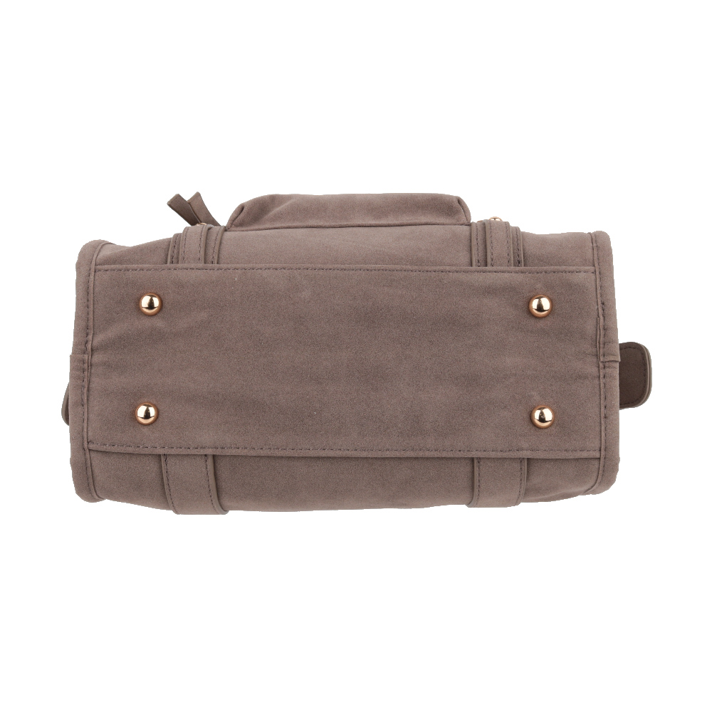 Mākslīgās zamšādas soma sievietēm. Izmērs: 28 × 18 × 14 cm. Krāsa – brūna.