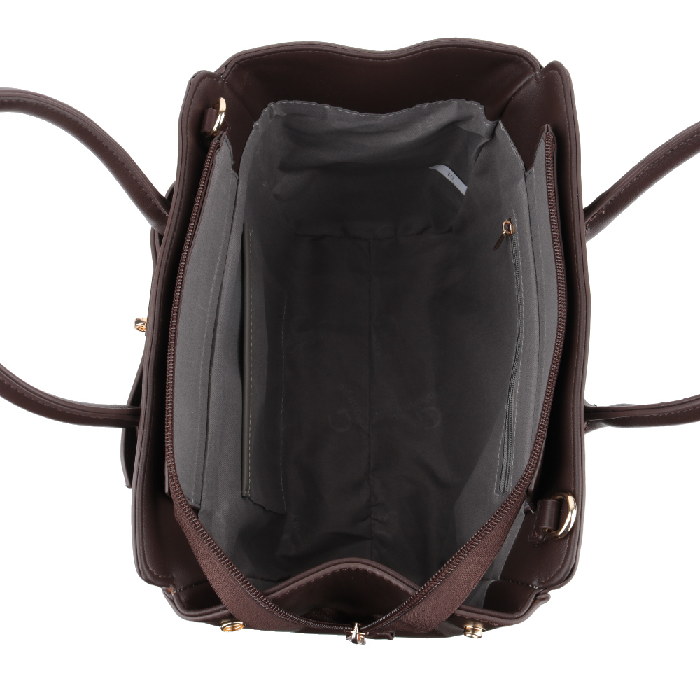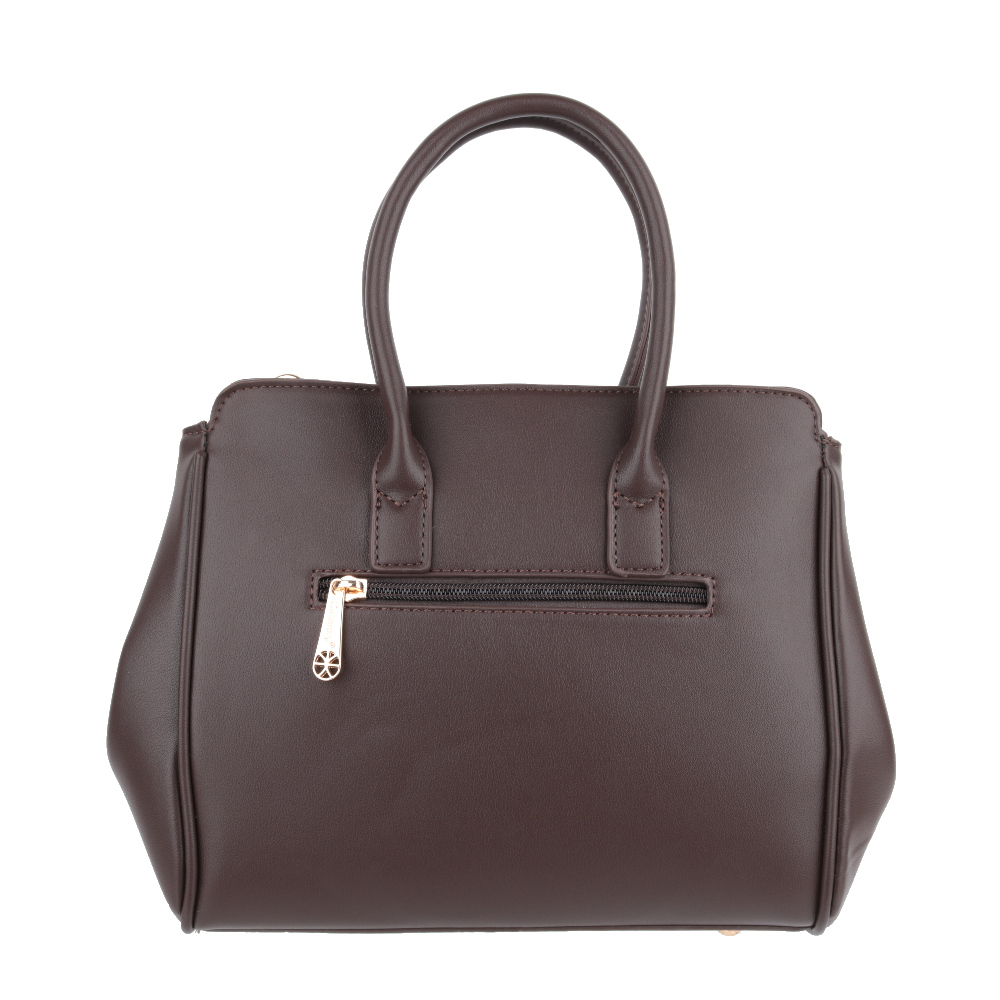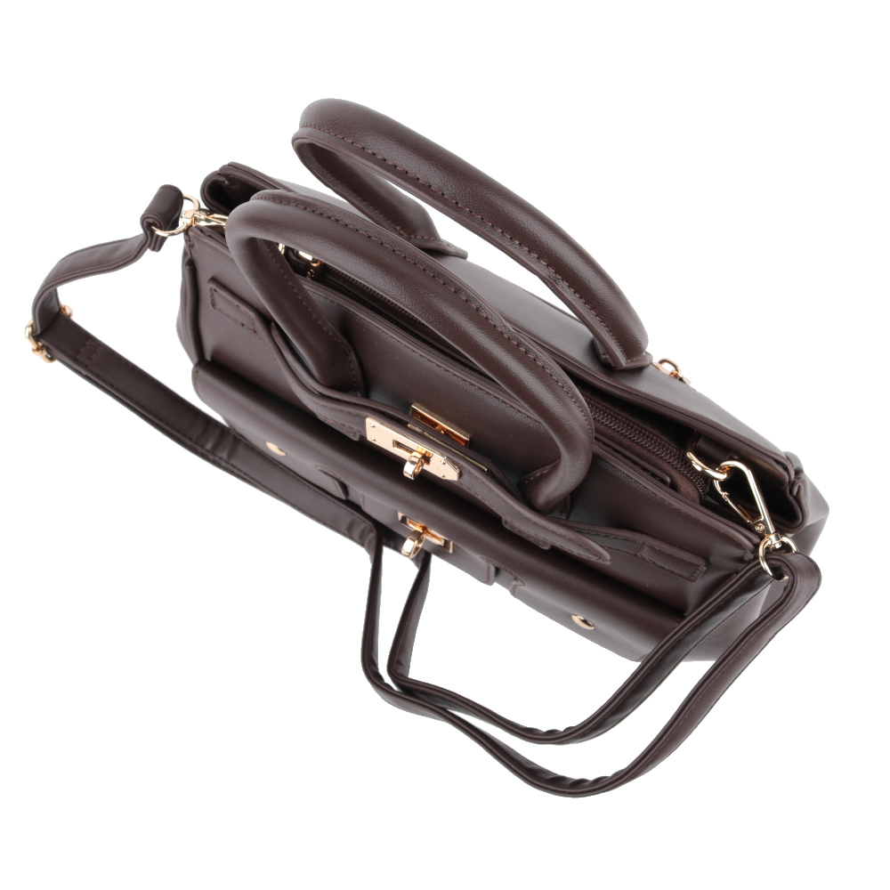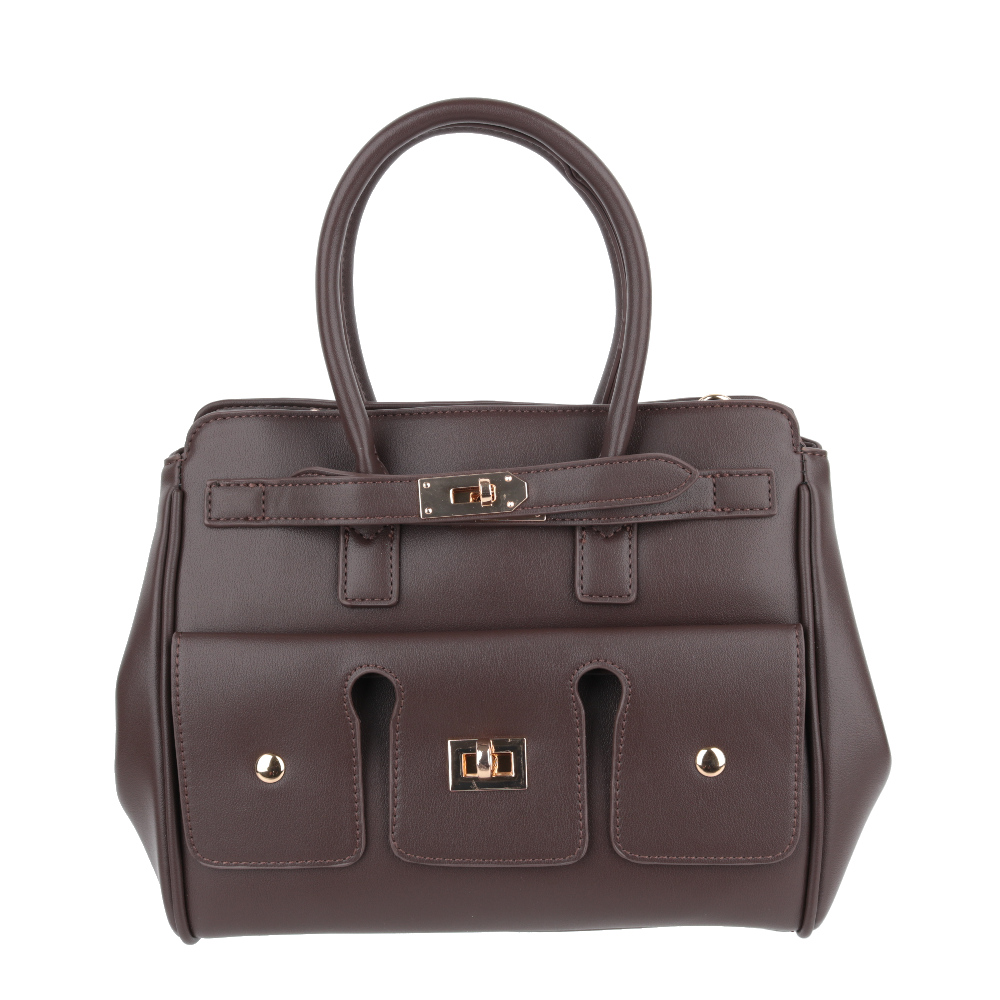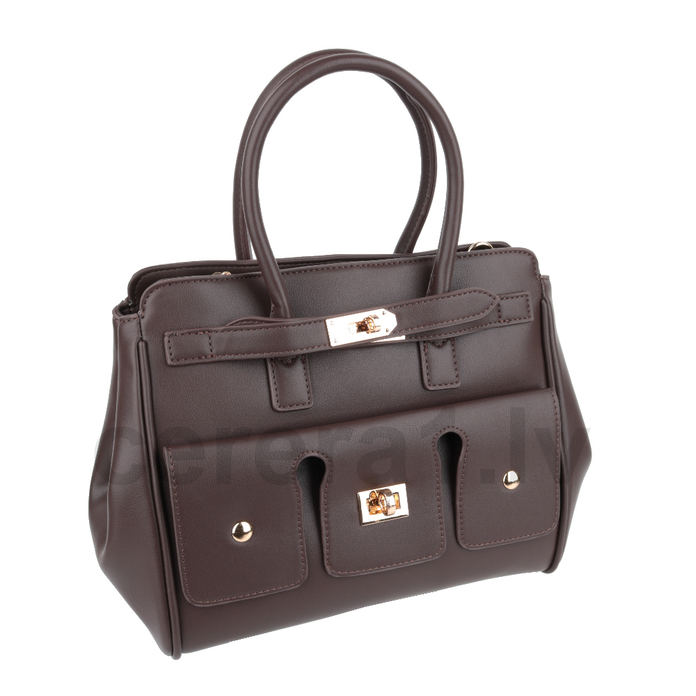Mākslīgās ādas soma sievietēm. Izmērs: 30 × 22 × 12 cm. Krāsa – brūna.