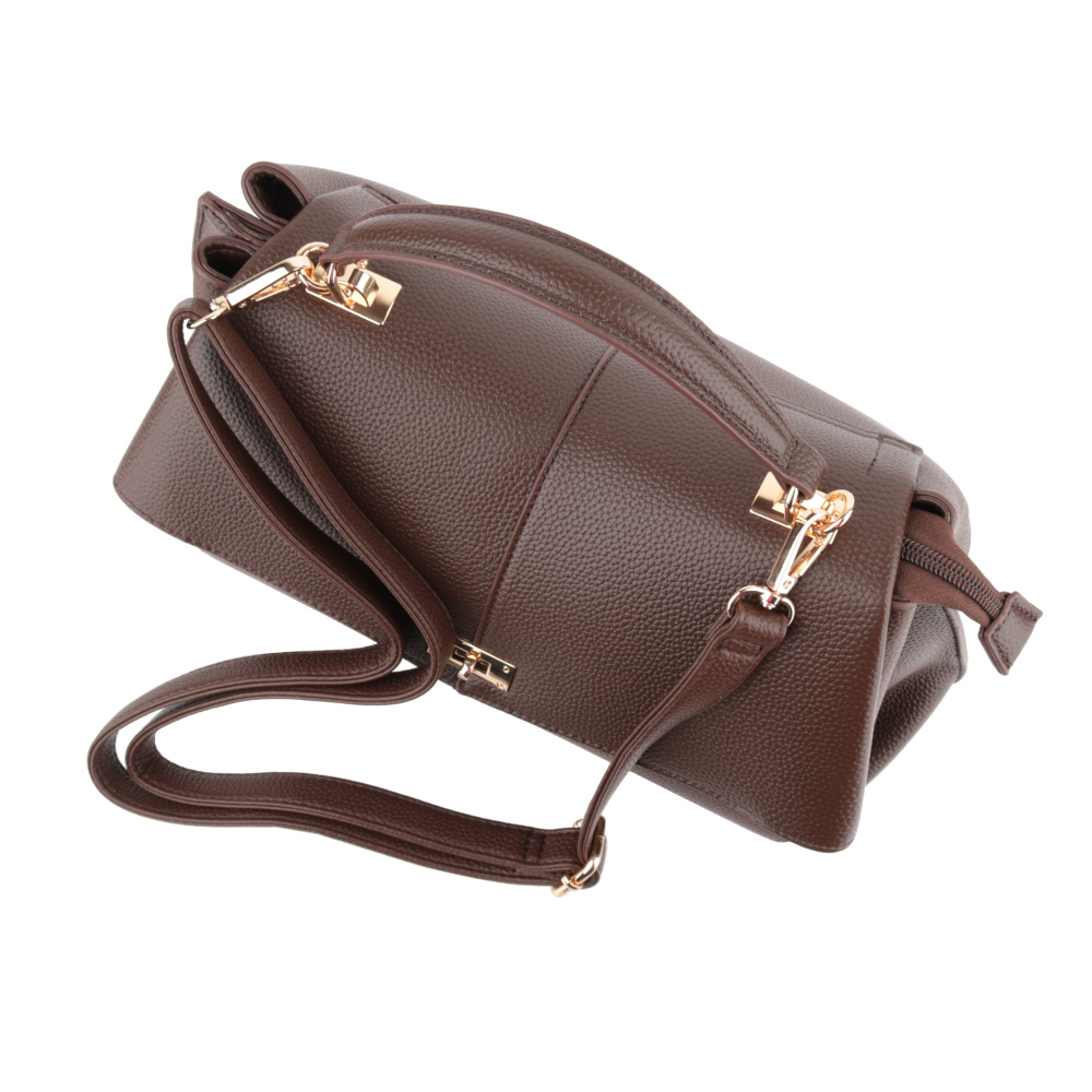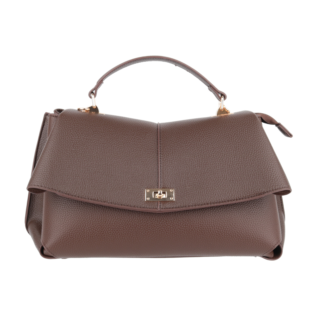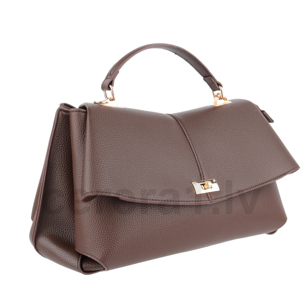 Mākslīgās ādas soma sievietēm. Izmērs: 35 × 19 × 17 cm. Krāsa – brūna.