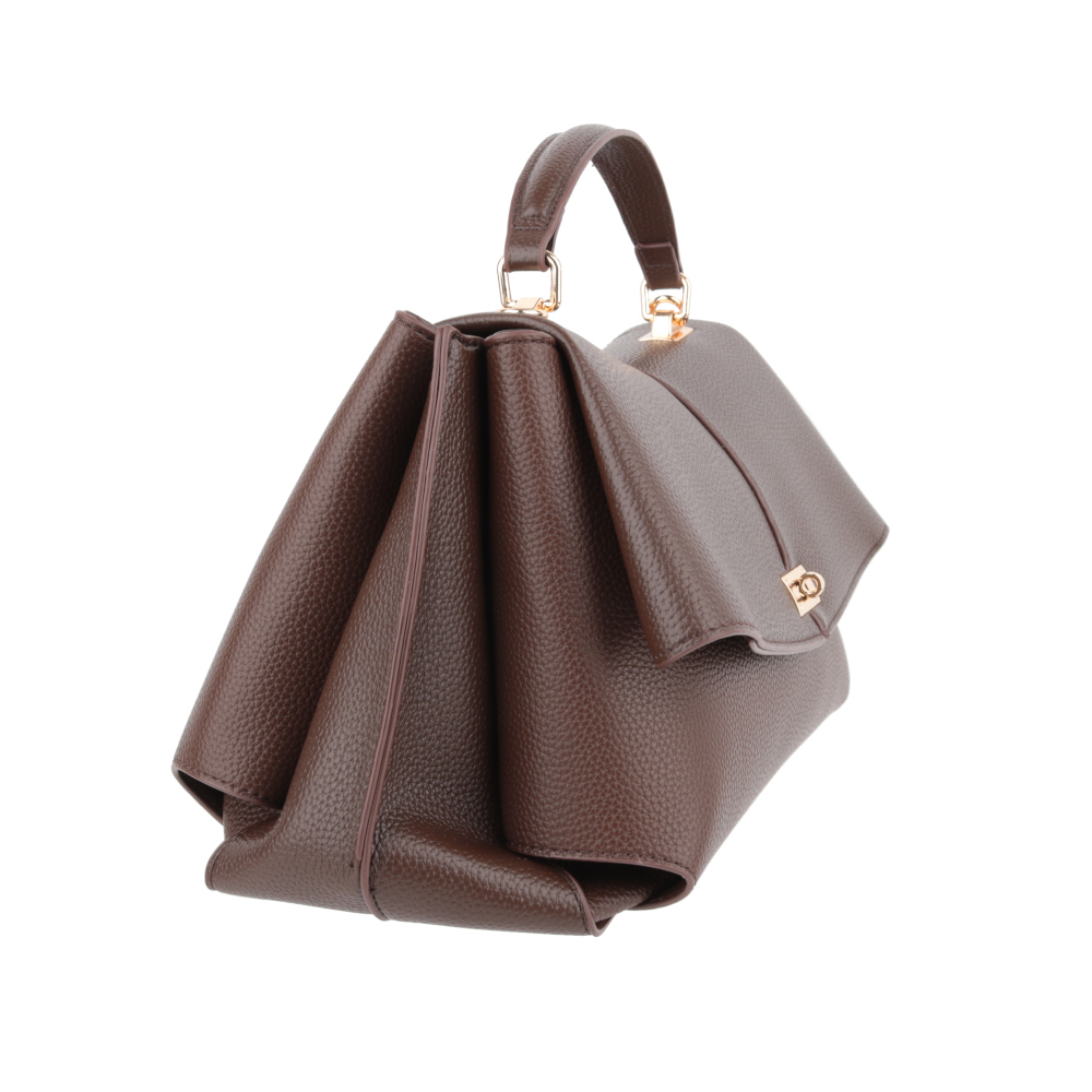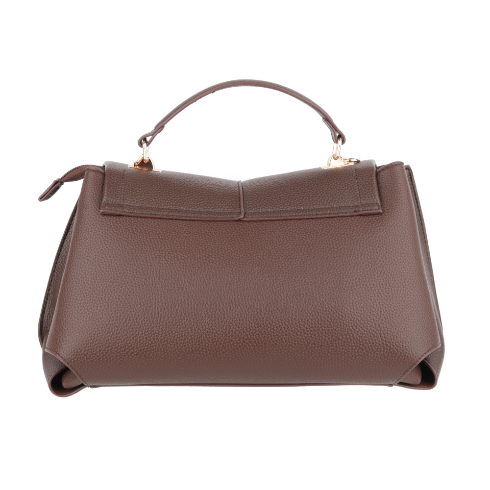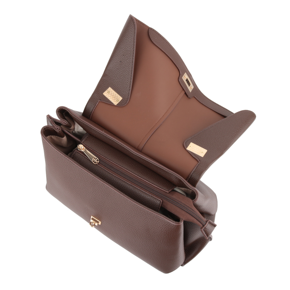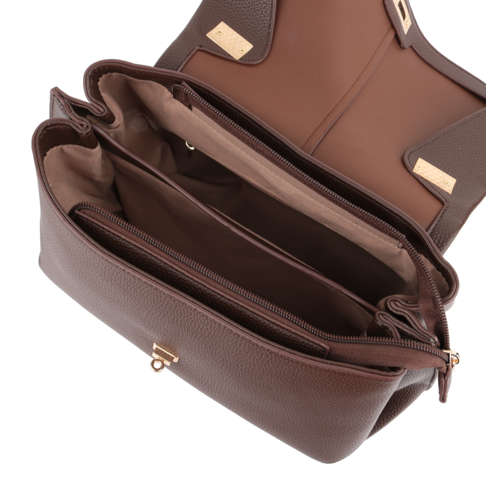 Mākslīgās ādas soma sievietēm. Izmērs: 35 × 19 × 17 cm. Krāsa – brūna.