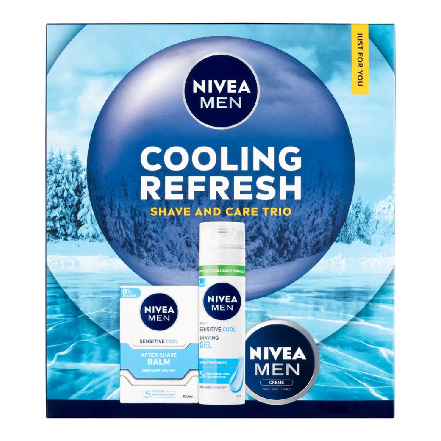 Dāvanu komplekts vīriešiem ar NIVEA COOLING REFRESH SHAVE AND CARE TRIO, kurā ietilpst balzāms pēc skūšanās 100 ml, skūšanās putas 200 ml, krēms sejai, ķermenim un rokām 75 ml.