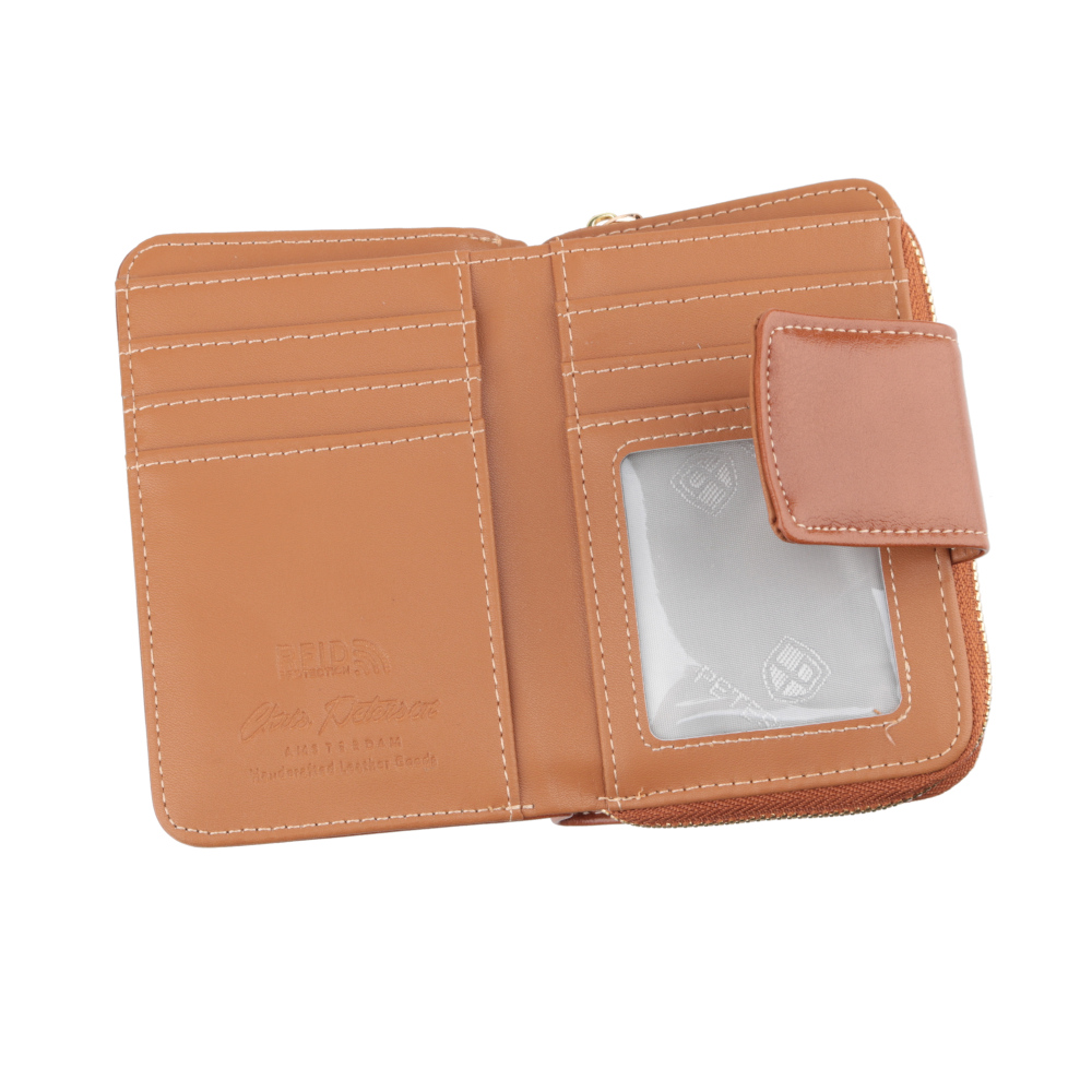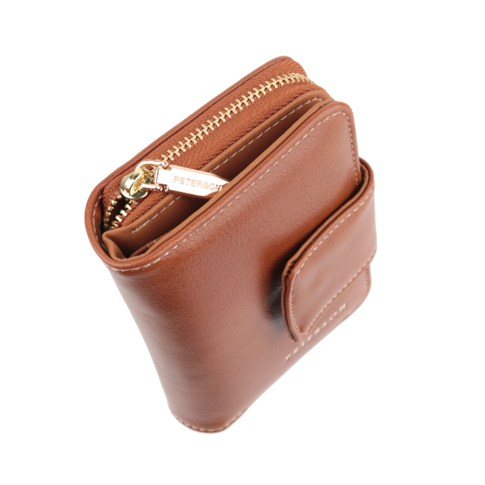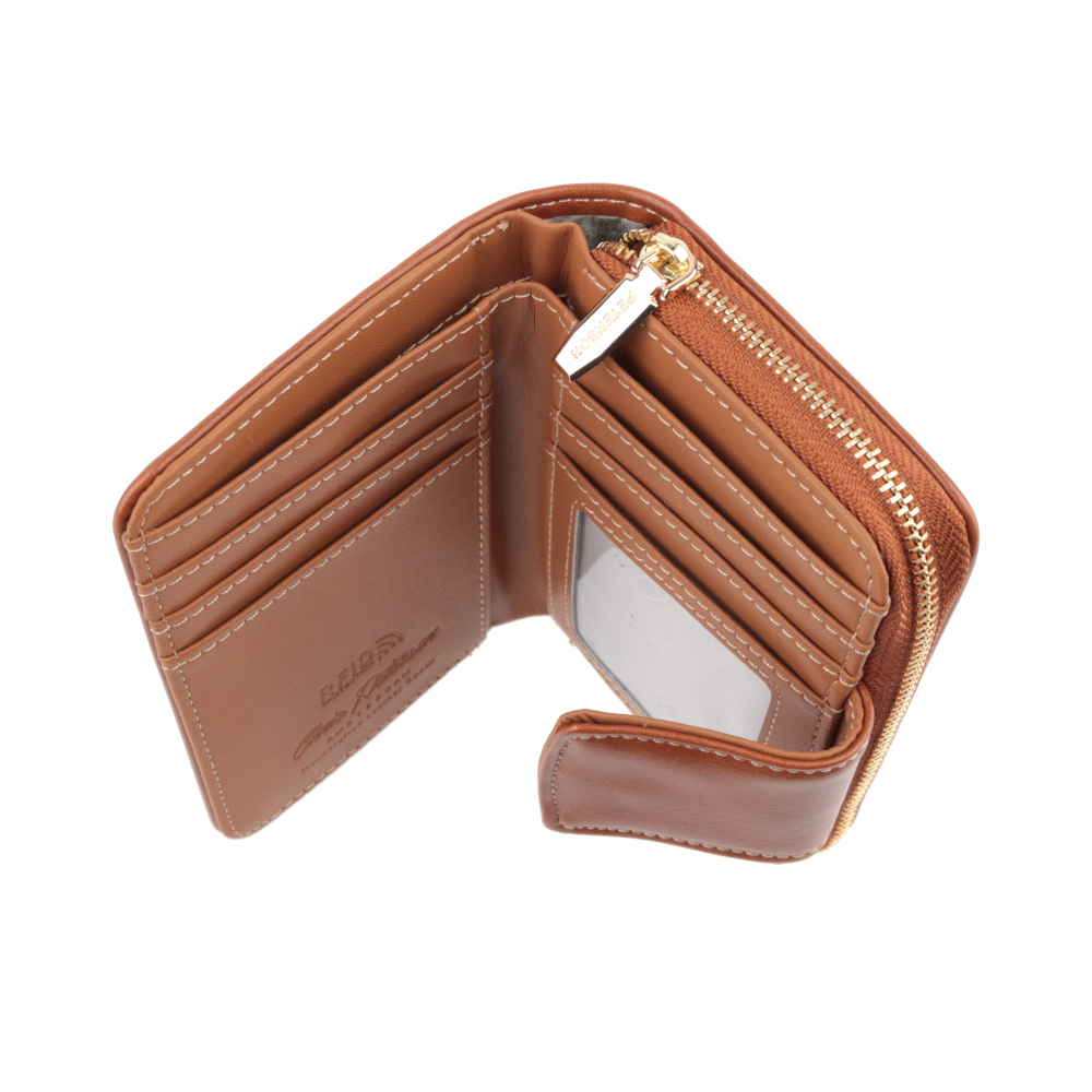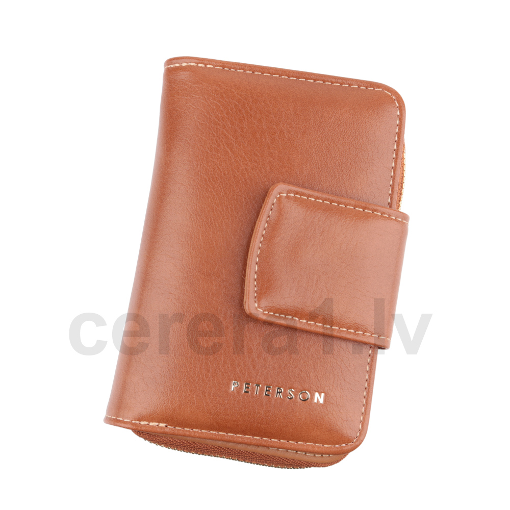 Mākslīgās ādas maks sievietēm. Izmērs: 9 × 13 × 3.5 cm. Krāsa – brūna.